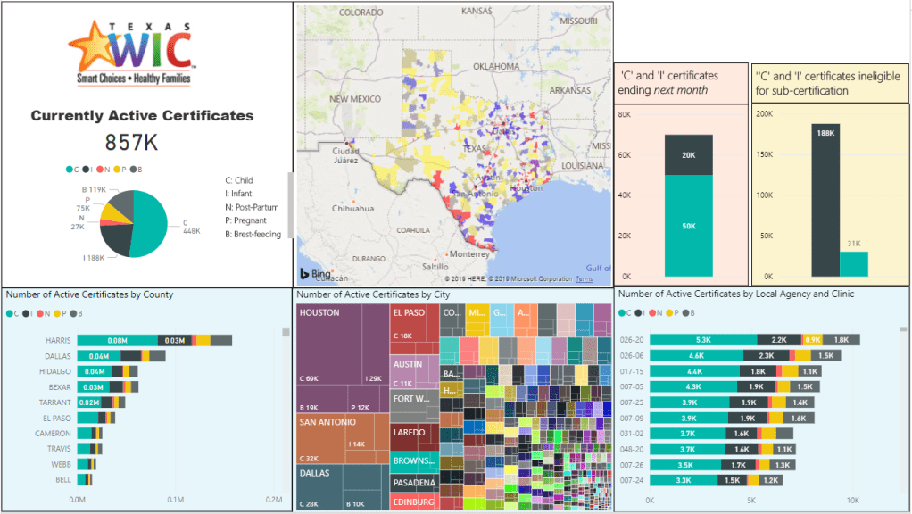 The first view showed a map of Texas with the Local Agencies highlighted. The number of certificates for the five certificate types is shown overall (upper left), by County (lower left), by city (lower center and Local Agency-Clinic. One can click on any of these to zero in on the status of that area. For example, if you click on Houston in the lower center, you get the next view.
