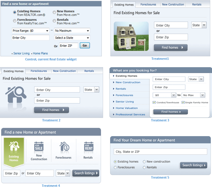 The MSN Real Estate site wanted us to run a test to improve revenue for an advertising widget. They had a design company make five new widgets to compete with the current one. (By convention, the default user experience is called the Control and the competitors are known as Treatments. If there are no Treatments better than the Control, best practice is to keep the Control.) The experiment tested all six widgets concurrently by randomly assigning one-sixth of users to see each widget over a two week period. Here are the six competitors. Before you read further, check your understanding by guessing which widget would perform the best.